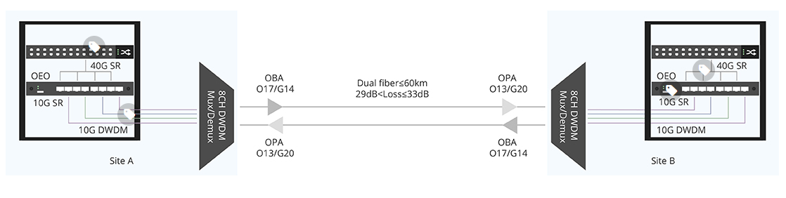 该解决方案具有较大的链路预算,可以实现80G 60km的数据传输,且无需额外增设光纤。如上图方案所示,一路40G光信号分成4路10G光信号,通过OEO将他们转换成相应的DWDM波长,添加色散补偿器和光纤放大器,链路传输距离可以超过60km,甚至达到80km。